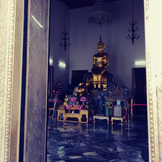 I then decided to walk to the next place, Wat Suthat, which is famous for the giant red swing out front that is 24 meters tall, built in 1784. Every year after the rice harvest, young men would swing on it as high as possible, and try to grab a bag of silver coins with their teeth. Needless to say, a lot of them were injured or died. They stopped the practice in 1932. The walk there was much longer than I anticipated...and it was so very hot.