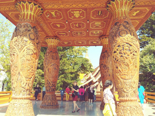 The story goes that around 1385 AD, the king placed the Buddha's relics on the back of a white elephant, and wherever the elephant died, they would build a temple to house the relics. There is a large wooden panel illustrating the story as you enter the grounds.