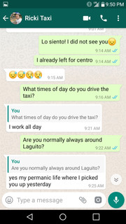 So. I mentioned Ricki, the taxi driver I had the first full day I spent in Cartagena. He gave me his Whatsapp so I could let him know when I needed rides. He started texting me almost immediately, which was weird, but I didn't want to be judgy since this is a different culture.