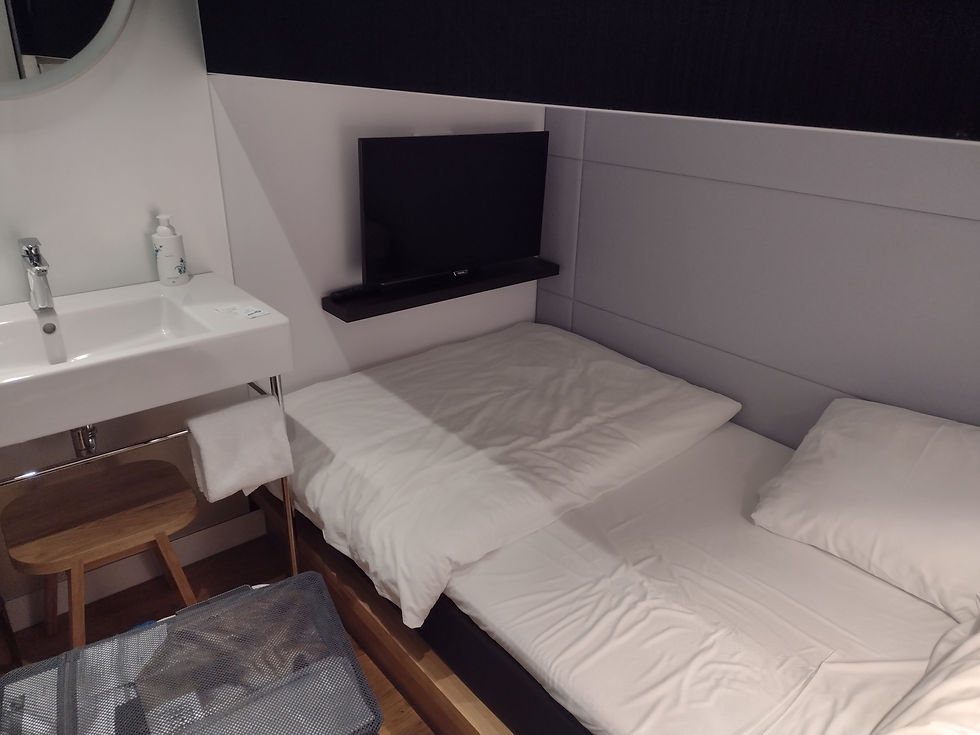 Best decision ever. For five hours, I had a tiny room with VERY comfortable bed (appreciated after two nights on a brick), a TV and a sink. I changed into PJs and passed out for four hours. Woke up, refreshed my hair and makeup, and headed back to the lounge for lunch--pasta and red sauce, salad, and a banana.