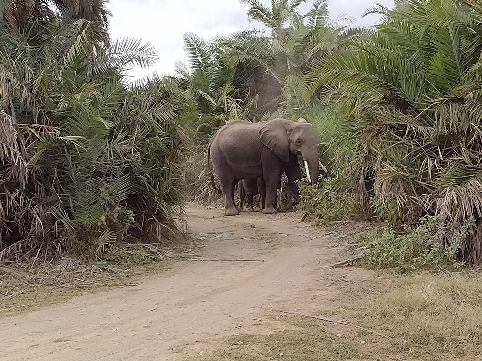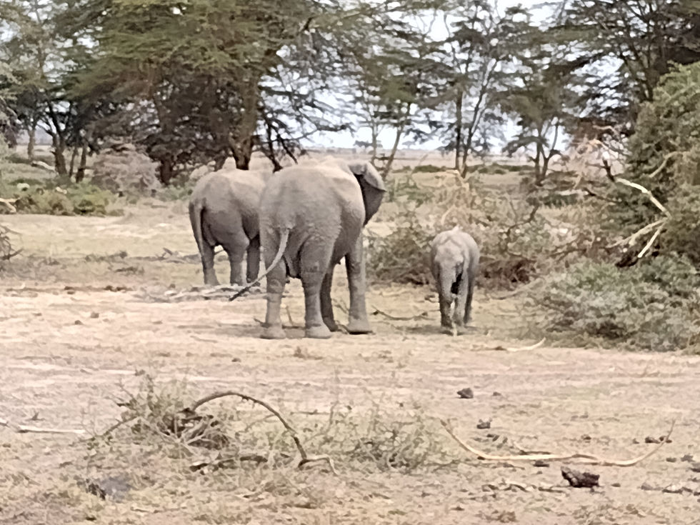 Headed out in the morning (after saying goodbyes to May and Maya who got up early to see us off) and were greeted by the same giraffe near the entrance we saw as we were leaving the night before. We also saw an area of the park that used to be a resort, but was flooded and went under literally and figuratively. Animals have taken it over--especially the velvet (blue-ball) monkeys. Saw lots of cranes (the national bird of Uganda), and sadly, a dead baby elephant. It wasn't attacked--there weren't even any vultures yet. It must have died from starvation or disease. So very sad. Benjamin had a habit of pointing out animals that looked sick and would probably die--which is not pleasant conversation--but it is real life. However...we also found a family of elephants outside of a female researcher's house (she lives in Amboseli)...and they were using the sign to scratch their butts. But still no Kilimanjaro! As Benjamin says, "Kilimanjaro is asleep."