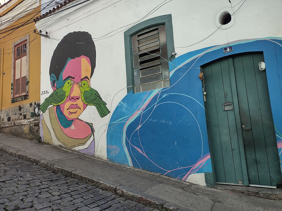 We walked down Olympic Boulevard which runs parallel to the water of Guanabara Bay. Lots of murals here thanks to the Olympics which were here in 2016, including a huge one by Kobra which features a face for each of the continents with other continents in between. Several were by women, which is cool.